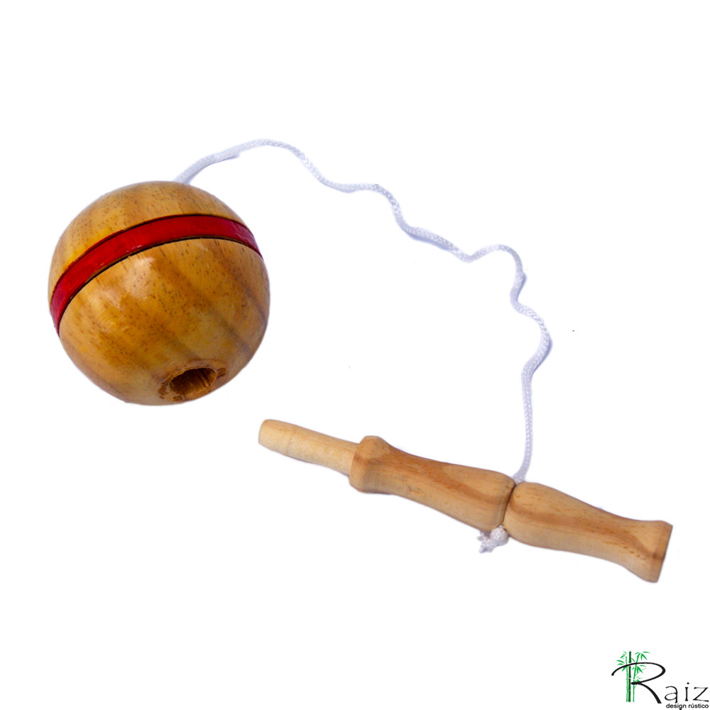 que consiste em uma esfera de madeira (ou de forma semelhante), com um orifício